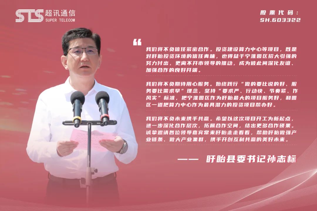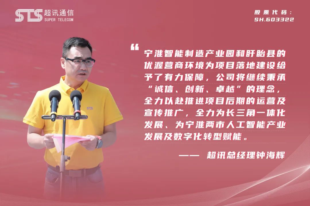 公司總經(jīng)理鐘海輝在致辭中闡述了選擇寧淮智能制造產(chǎn)業(yè)園作為新一代通信設(shè)備生產(chǎn)與研發(fā)基地,以及綠色數(shù)字經(jīng)濟算力中心項目所在地的重大戰(zhàn)略考量。其中,寧淮智能制造產(chǎn)業(yè)園及其所在地盱眙縣所提供的優(yōu)渥營商環(huán)境,為項目的順利啟動與建設(shè)提供了堅實支撐,對此公司深表感激。